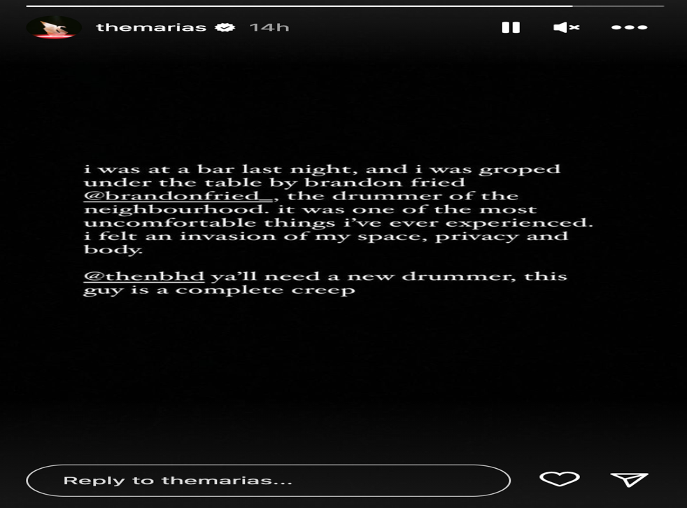 Taking to her Instagram story on Nov. Web The Neighbourhood have parted ways with drummer Brandon Fried after their former time-keeper was accused of inappropriately touching The Marías singer María. Web Rock band The Neighbourhood have booted their drummer Brandon Fried after he was slapped with a groping allegation.
